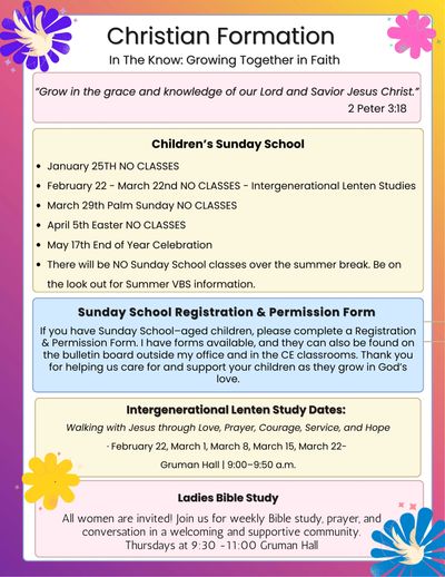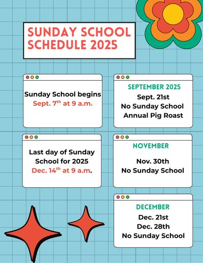 We meet for Sunday School in the Amy West Building across the parking lot each Sunday.